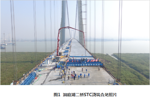由于岳阳洞庭湖二桥STC的浇筑规模空前,需要有高效、可靠的规模化施工技术作为支撑。团队联合施工单位开发了智能化成套施工装备,大幅提高施工效率。2017年9月1日,岳阳洞庭湖二桥试验段STC施工完成。以中铁大桥设计院徐恭义设计大师为首的专家组对试验段进行验收,一致认为施工设备先进,技术可靠,质量满足设计及规范要求。9月16日开始了STC的大规模施工,采用分幅分块交叉作业,全桥共分12块,每次约浇筑5500平米,历时48天完成全部浇筑。
