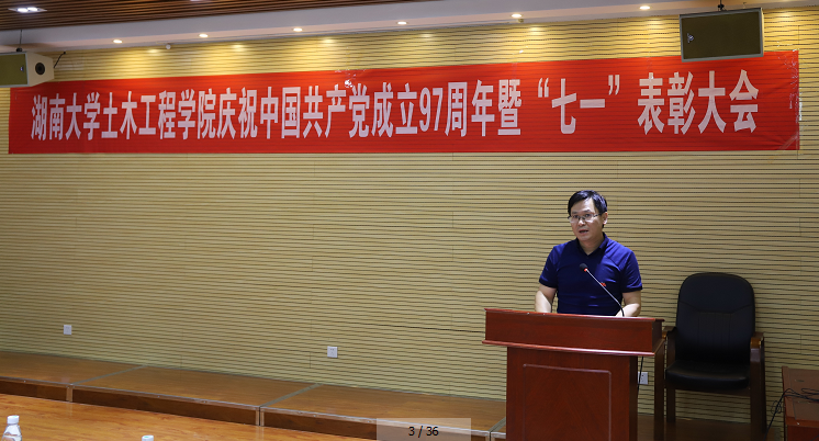 随后,土木院院长陈仁朋宣读了《“七一”表彰决定》,决定授予伟德体育官网岩土系党支部等7个党支部为学院“先进党支部”;刘晓明等6位同志为学院“优秀党支部书记”;李峥等7位同志为学院“优秀党务工作者”;赵明华等26位同志为学院“优秀共产党员”荣誉称号。除此外,伟德体育官网党委荣获BV伟德官方网站先进基层党委,建筑环境与能源应用工程系党支部、国防生党支部荣获BV伟德官方网站先进党支部,董咨佑同学荣获湖南省高校百佳大学生党员称号。