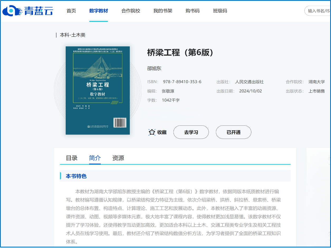 《桥梁工程(第6版)》数字教材,由人民交通出版社出版。该数字教材于2024年10月在“青蓝云”数字教材平台上线,是我国桥梁工程领域首部数字教材。学院桥梁系教学团队在2025年春季学期《桥梁工程(2)》本科课程教学中首次应用了该数字教材,探索出数字教材融入课堂的新范式。《桥梁工程(第6版)》数字教材已被包括8所“双一流”大学在内的42所院校注册使用,不仅涵盖了公路、铁路等各类土木院校,还包括10余所高职学校,受众面广,受到广大师生的喜爱。该数字教材还获得了人民交通出版社2024年度优秀图书奖。